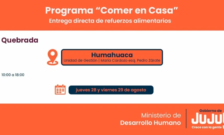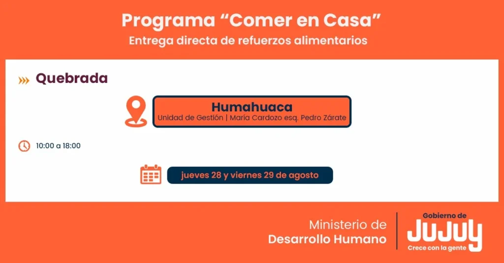 El Ministerio de Desarrollo Humano de Jujuy, a través de la Secretaría de Asistencia Directa, comunica que desde el jueves 28 de agosto iniciará la entrega directa de módulos alimentarios del Programa “Comer en Casa” a familias de Humahuaca y Yavi.