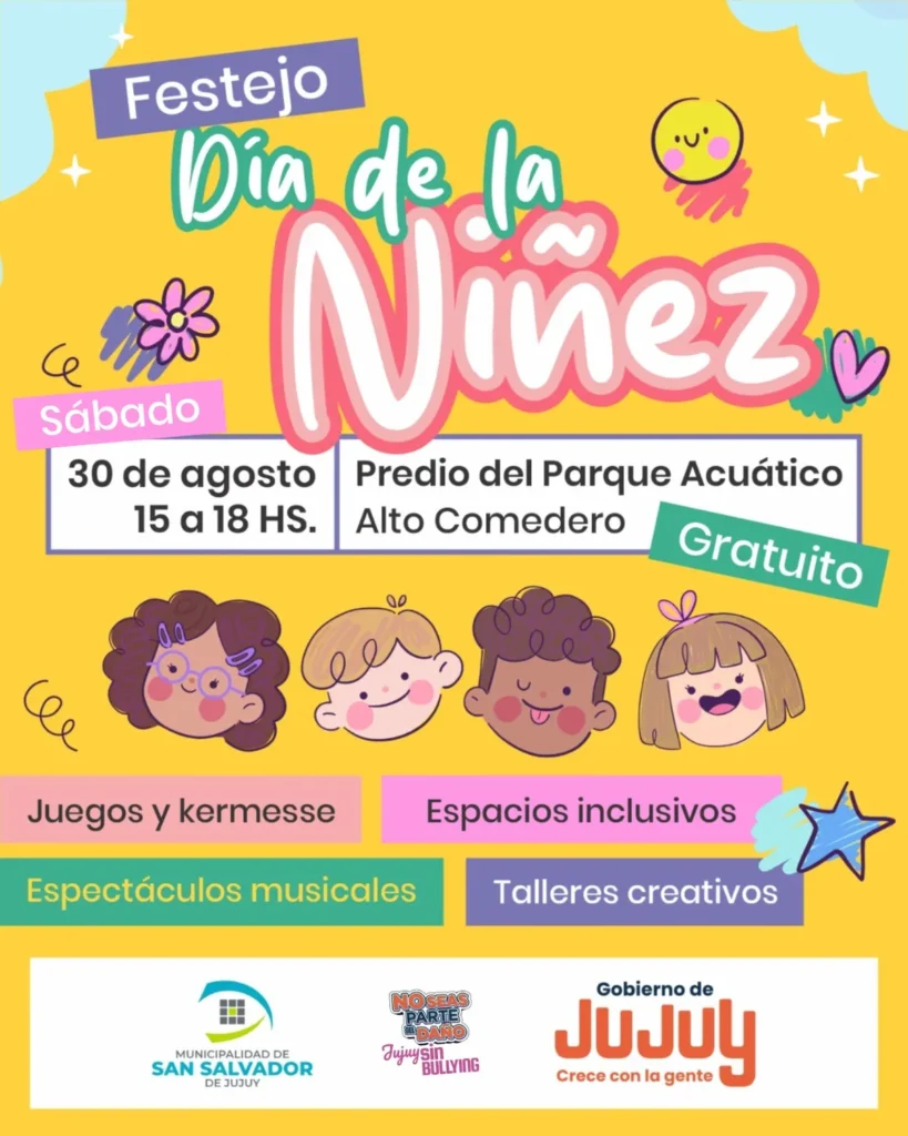 El Gobierno de la Provincia de Jujuy, a través de los distintos Ministerios y la Municipalidad de San Salvador de Jujuy invita a toda la comunidad a participar del gran festejo por el Día de la Niñez, que se llevará adelante el sábado 30 de agosto, de 15 a 18 horas, en el predio del Parque Acuático de Alto Comedero.
