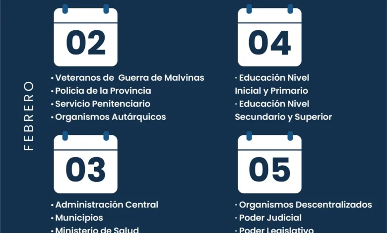 – Lunes 2 de febrero: veteranos de guerra de Malvinas, Policía de la Provincia, Servicio Penitenciario y Organismos Autárquicos.