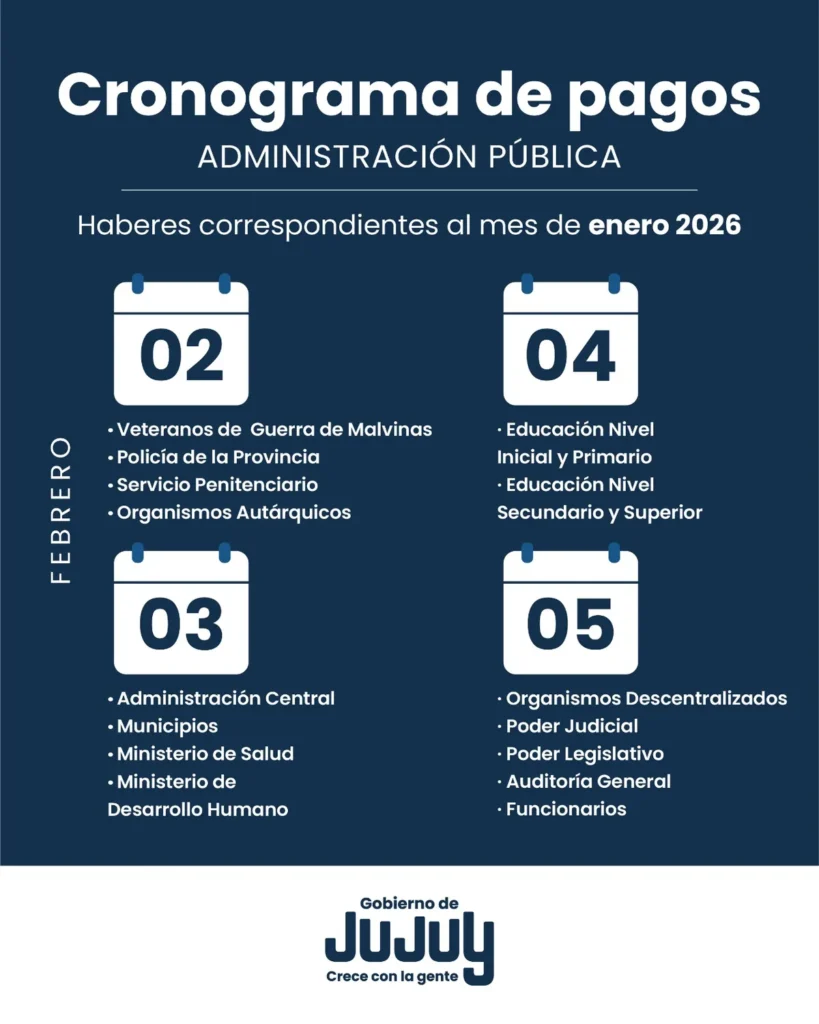 La Tesorería de la Provincia de Jujuy informó que el cronograma de pagos a la administración pública iniciará el lunes 2 de febrero y se extenderá hasta el jueves 5 de febrero.