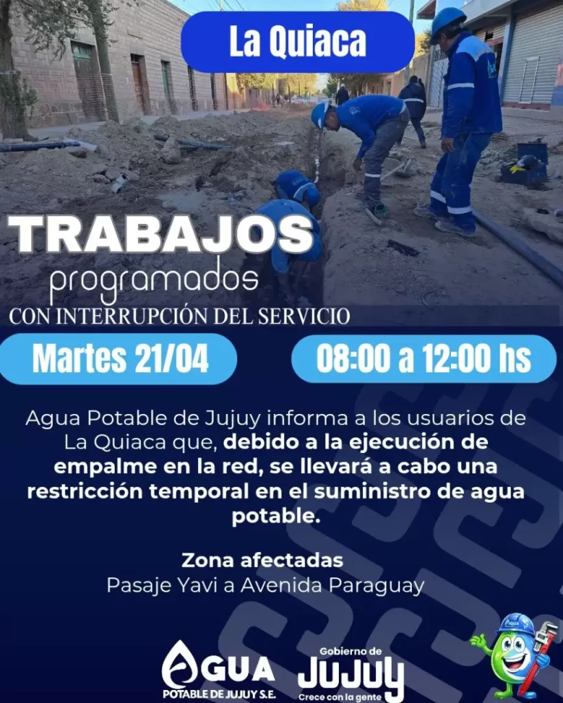 Agua Potable de Jujuy informó que este martes 21 de abril se realizará una interrupción programada del servicio en la localidad de Maimará, La Quiaca y San Antonio.