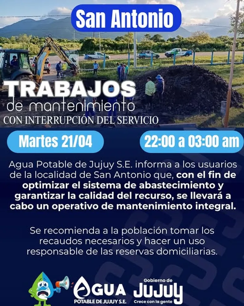 Por otra parte, Agua Potable de Jujuy S.E. informó a los usuarios de la localidad de San Antonio que se llevará adelante un operativo de mantenimiento integral con el objetivo de optimizar el sistema de abastecimiento y garantizar la calidad del recurso. El mismo será desde las 22 horas hasta las 3 de la madrugada del miércoles.