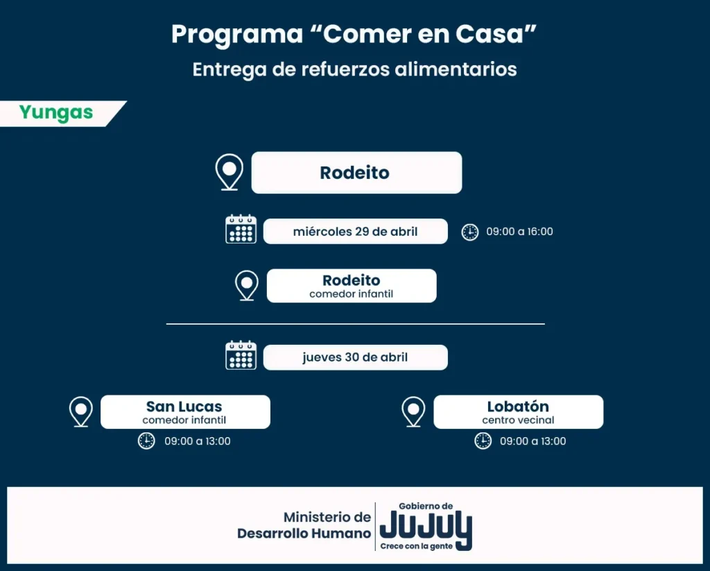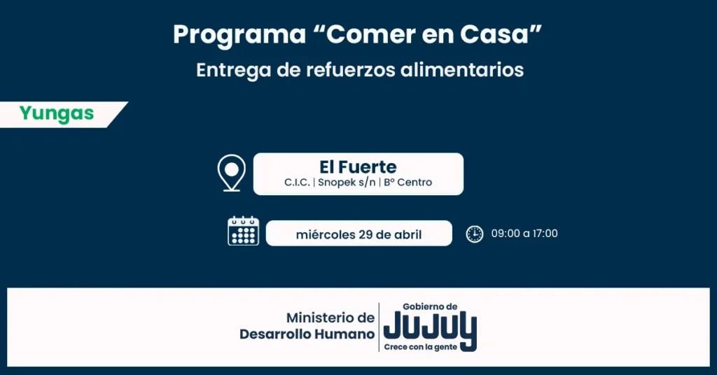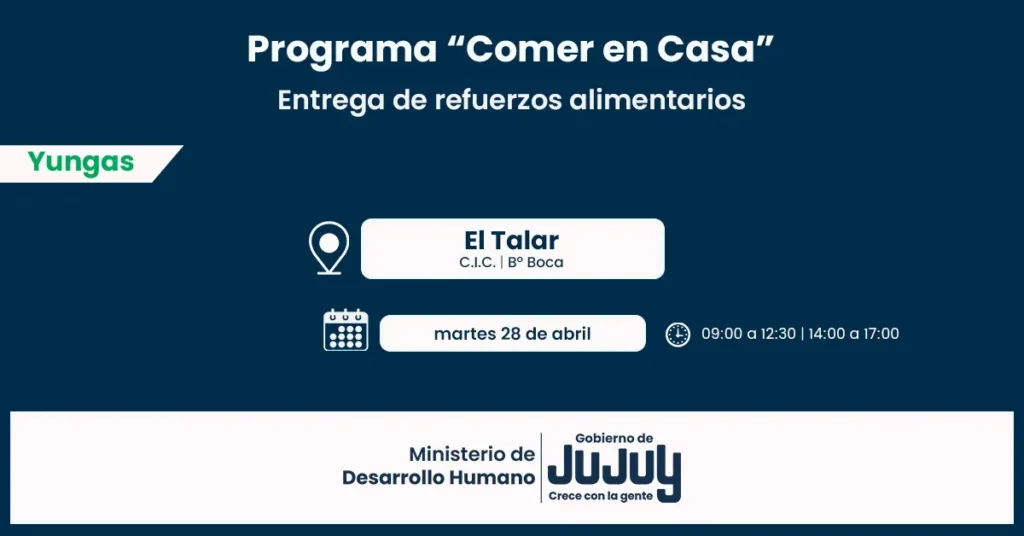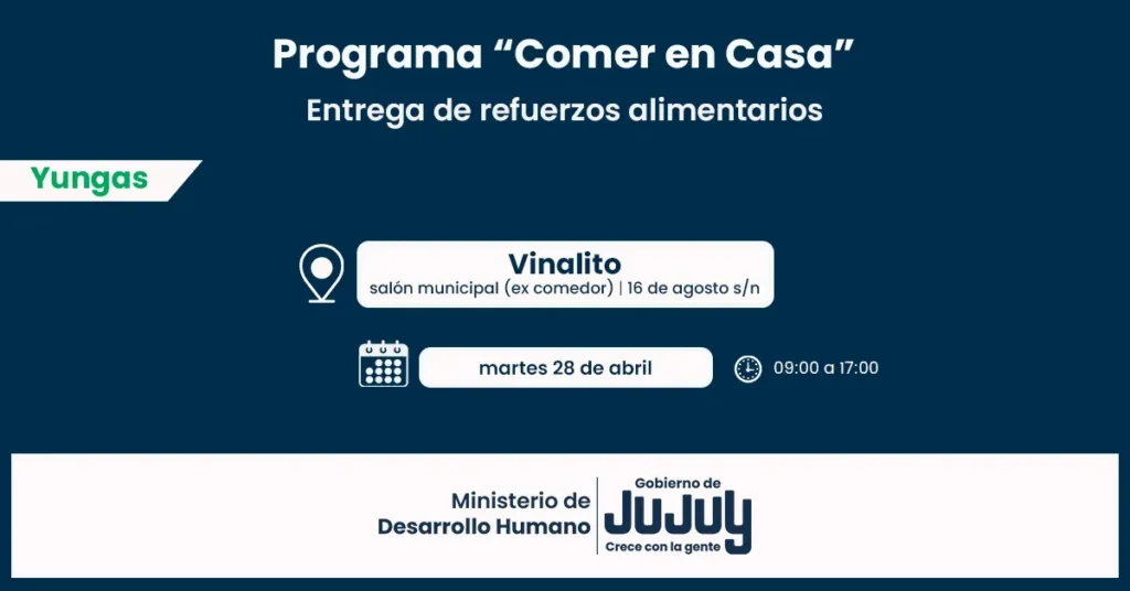 El Ministerio de Desarrollo Humano, mediante la Secretaría de Asistencia Directa, comunica que, desde el martes 28 de abril, se llevará a cabo la entrega directa de las unidades alimentarias del Programa “Comer en Casa”, a familias de Vinalito, El Talar, El Piquete, El Fuerte, Santa Clara y Rodeito del departamento San Pedro.